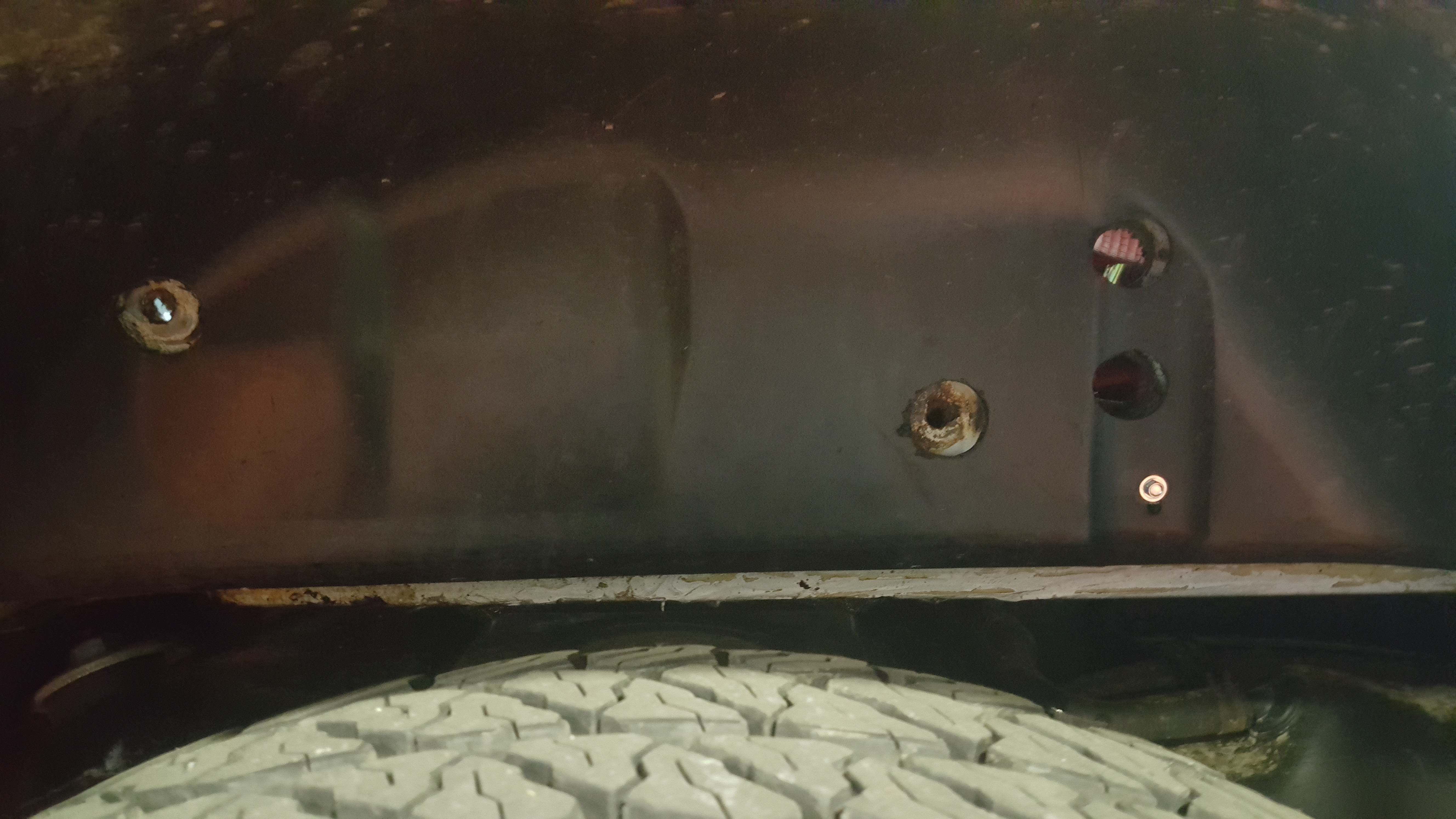 Now that I've downloaded the picture to see it in more detail, the holes are enormous (two of them, at least) and may have been feed-throughs for cables or pipes with grommets. They have also drilled through the wheel-arch liner, which you wouldn't normally do if just fitting regular ( eg 17 mm) bolts for accessories. I'd get them welded-up or perhaps, apply some galvanised cover-plates with an automotive bodywork PU adhesive, such as 'Tigerseal' , which will not burn the paint like welding.